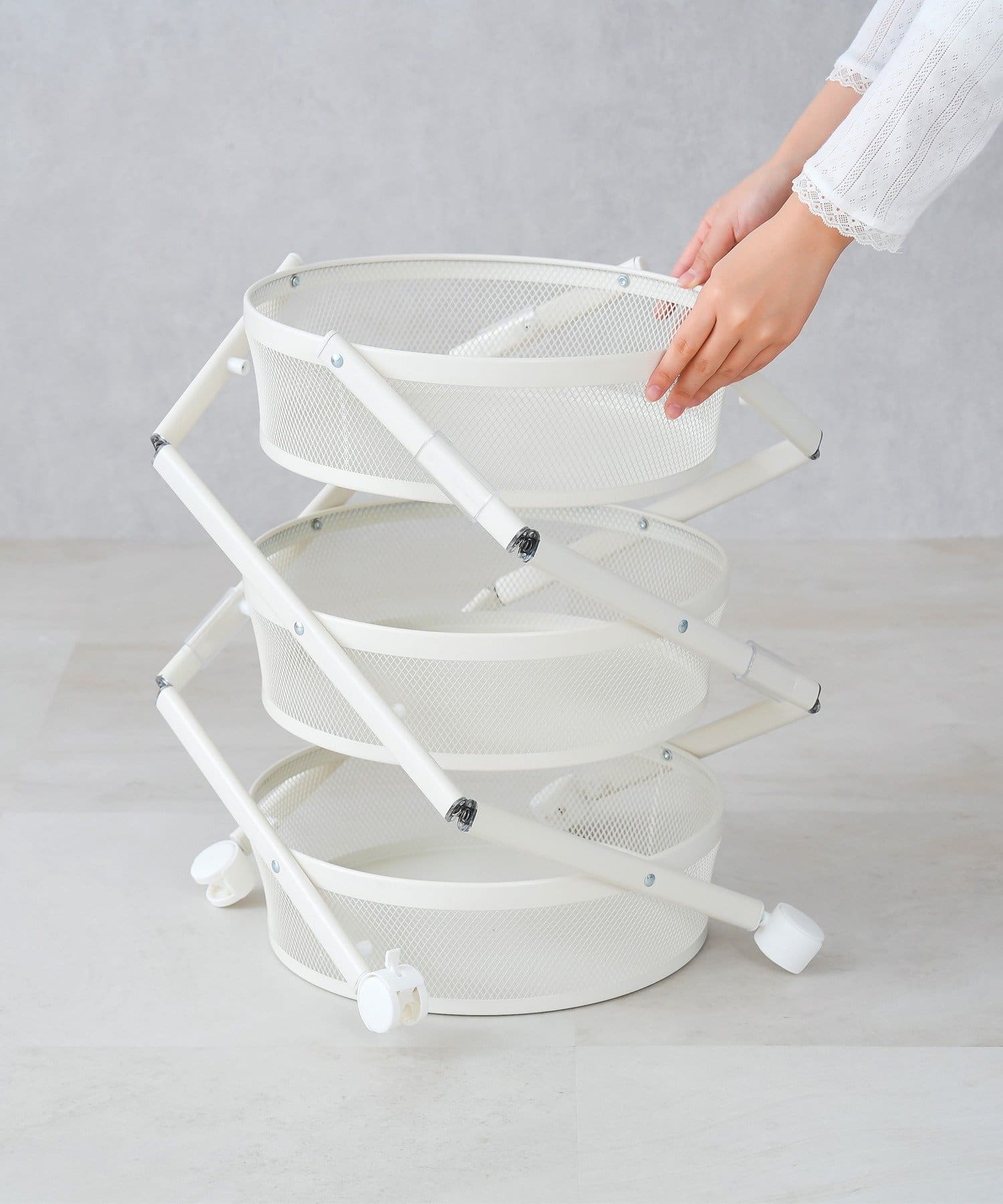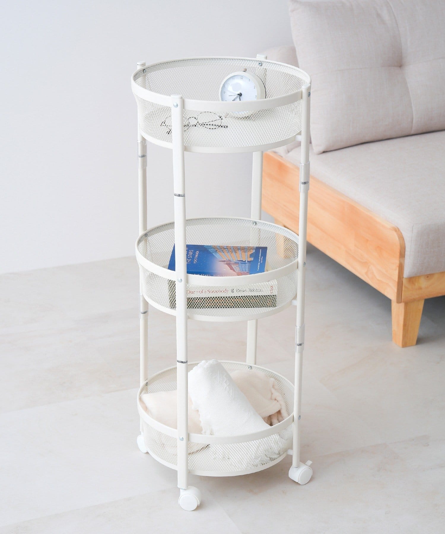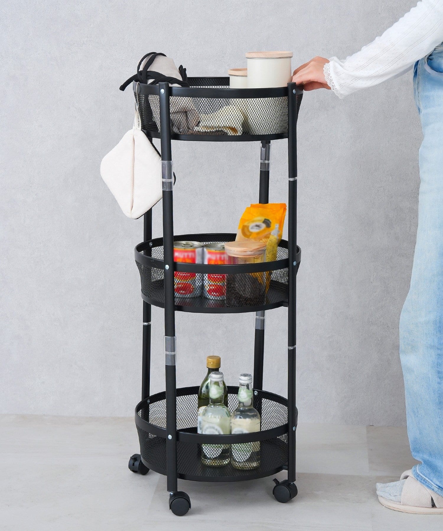 キャスター付きで移動も楽ちんな3段の収納ワゴンは、家中どこでも使えます。通気性のいいメッシュバスケットでサビにも強く、長く使えて長い目で見るとコスパもいいです。