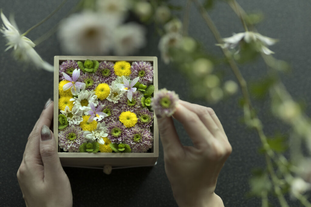 出発前には、室礼(しつらい)に供えた花を使ってお花箱を作り、自宅にに持ち帰っても◎。大切な人と過ごすかけがえのない時間です。