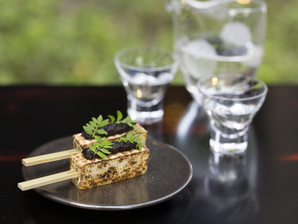 季節のおつまみとお酒を楽しむ、夕食前のひとときもご用意。メニューは江戸時代に広く親しまれていた豆腐田楽と、それに合わせた日本酒です。爽やかな香りの木の芽味噌が春の訪れを感じさせます。