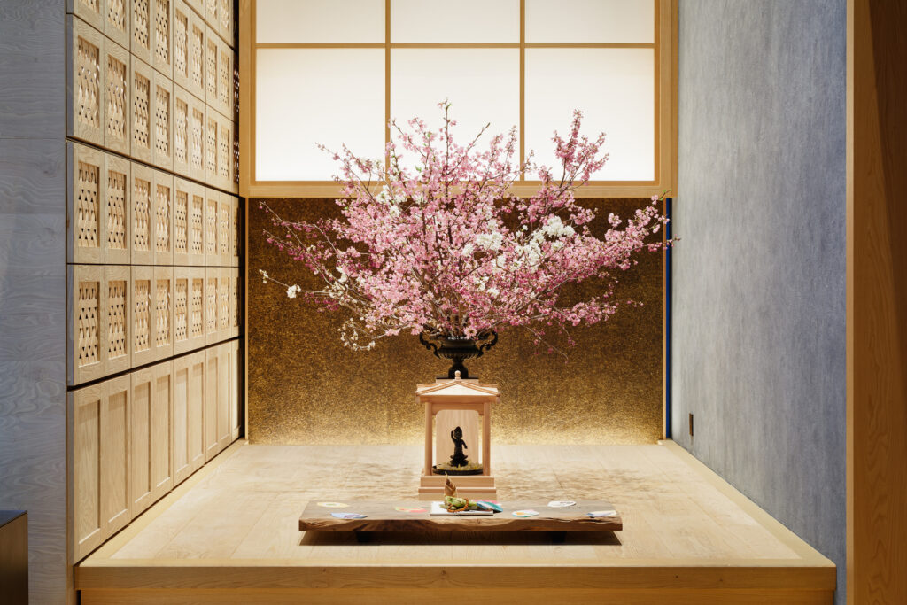 お酒や料理と一緒に花見を楽しんでいた江戸文化に倣い、空間には桜の室礼も。江戸時代の歴史を感じながら儚い桜を愛でる粋な体験です。