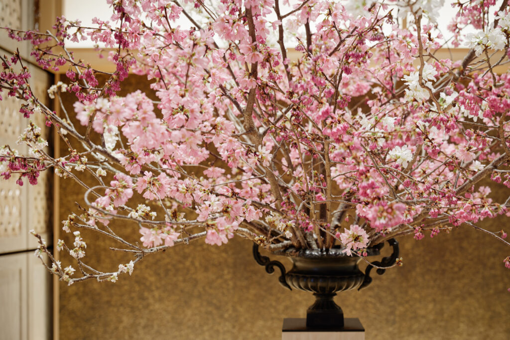 「花の開花」は、春の始まりの情景を表す言葉として日本でよく使われていますよね。人生の節目や門出を迎えるこの時季、星のや東京スタッフと専属の華道家と一緒に、滞在中に過ごす客室や共有スペースに花を飾り、大切な人にさりげなく想いを伝えることができます。