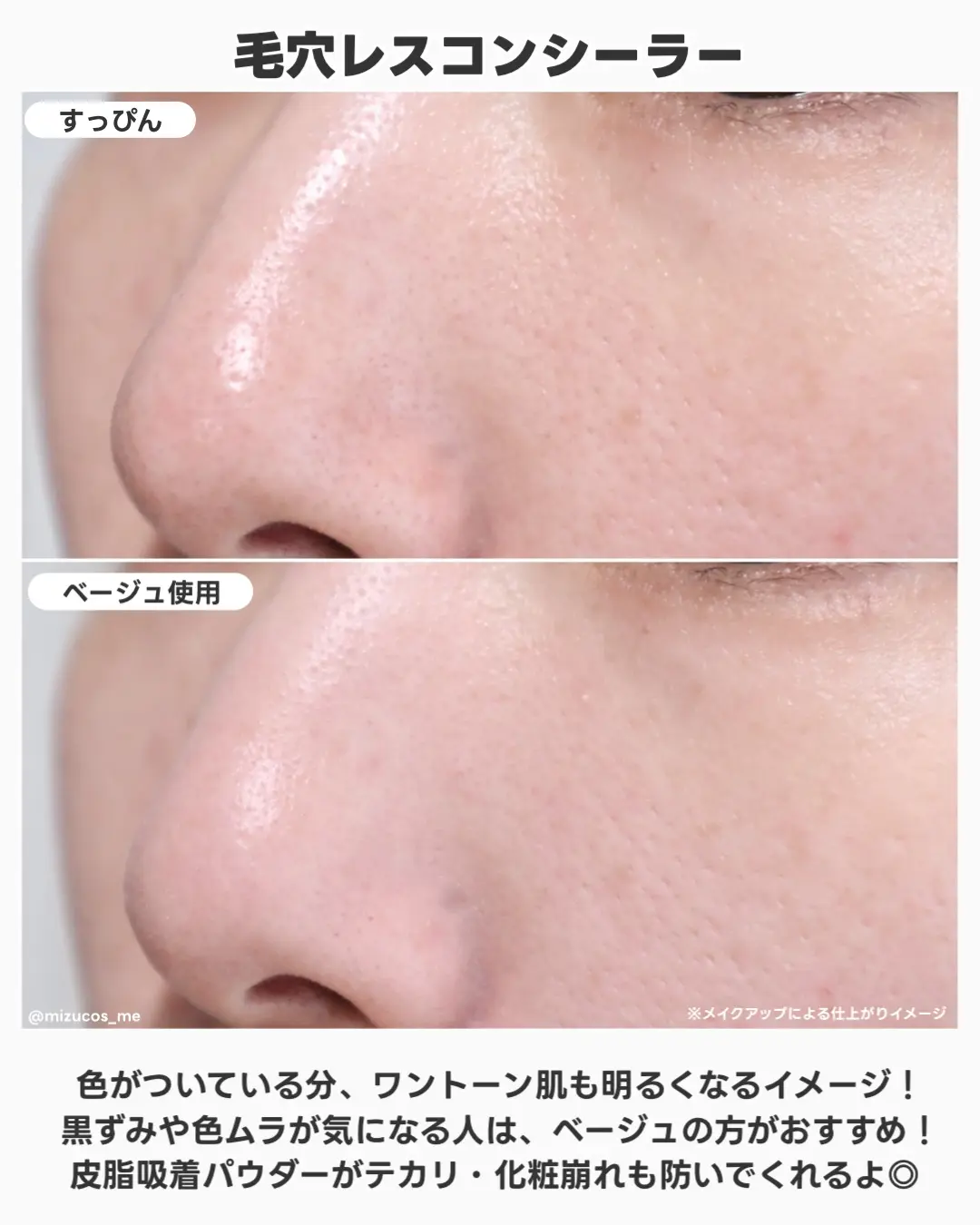 毛穴悩みを補正するコンシーラーから、凹凸毛穴を補正するだけでなく、黒ずみ毛穴もカバーしてくれるベージュタイプが登場しましたよ♡小鼻のぷつぷつした黒ずみは目立つので、気になりますよね。肌になじむベージュで、肌トーン全体が自然に上がってきれいに見えますよ。