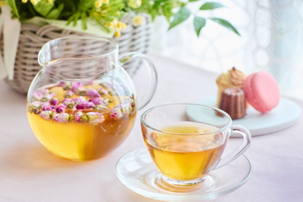 お湯をゆっくりと注ぐと、北海道のシンボルであるハマナスの花が浮かびます。桜の葉とハマナスのふわっとした香りと、スッキリとした味わいが特徴です。