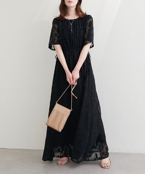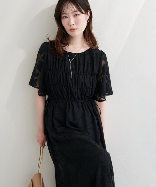 ジャガード織りが大人の華やぎを演出するワンピース。ウエストリボンでシルエットを自由に変えられるから、自分に合ったバランスで着こなせます。フレアスリーブが動くたびに軽やかさを添えて、上品だけどかしこまりすぎない印象に。オケージョンシーンにはもちろん、あえてスニーカーで外して日常に落とし込むのも素敵です。