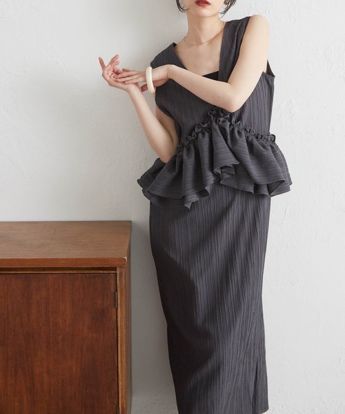 一枚でここまで着回せるの?と思わず試したくなる自在ワンピ。フリルの位置を変えるだけで、オフショル風、斜めデザイン、ペプラム風と自由に印象を切り替えられます。気分やシーンに合わせて楽しめるから、“いつも同じ服”感が出にくいのも好ポイント。ナローシルエットで全体はすっきり。遊びが効いているのに大人っぽく整うなんて…最高です♡