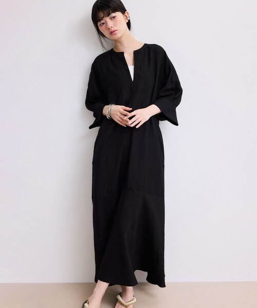 春夏の日差しにふわっとなじむ、麻混生地が主役のワンピース。さらりとした質感が光をやわらかく受けて、着るだけで季節に合った清涼感をまとえます。キーネックで顔まわりはシャープ、ウエストのシェイプでレディな雰囲気もアップ。二の腕をカモフラージュしてくれるボリューム袖も主張控えめで、ワードローブのマストアイテムになりそうな予感。