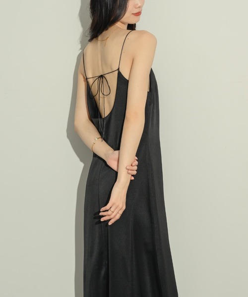 バックオープン×華奢リボンが、歩くたびに視線を引き寄せるキャミワンピース。サテンの落ち感と品のある光沢が動きに合わせて雰囲気を変え、オーラをまとったような佇まいが完成します。華やかすぎないのに、ちゃんと印象に残る空気感で、大人の余裕を引き出してくれること間違いなし。