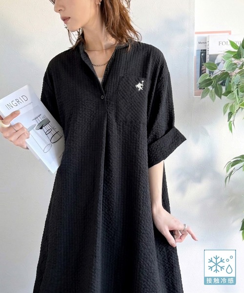 【接触冷感機能付き】サラッと着こなす。胸刺繍入りポケットデザインロールアップサッカーワンピース(ロング丈)