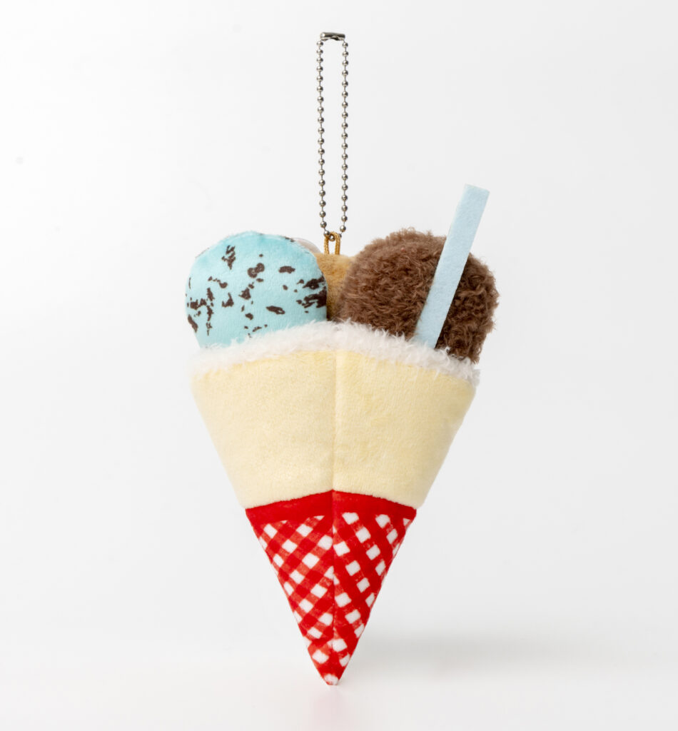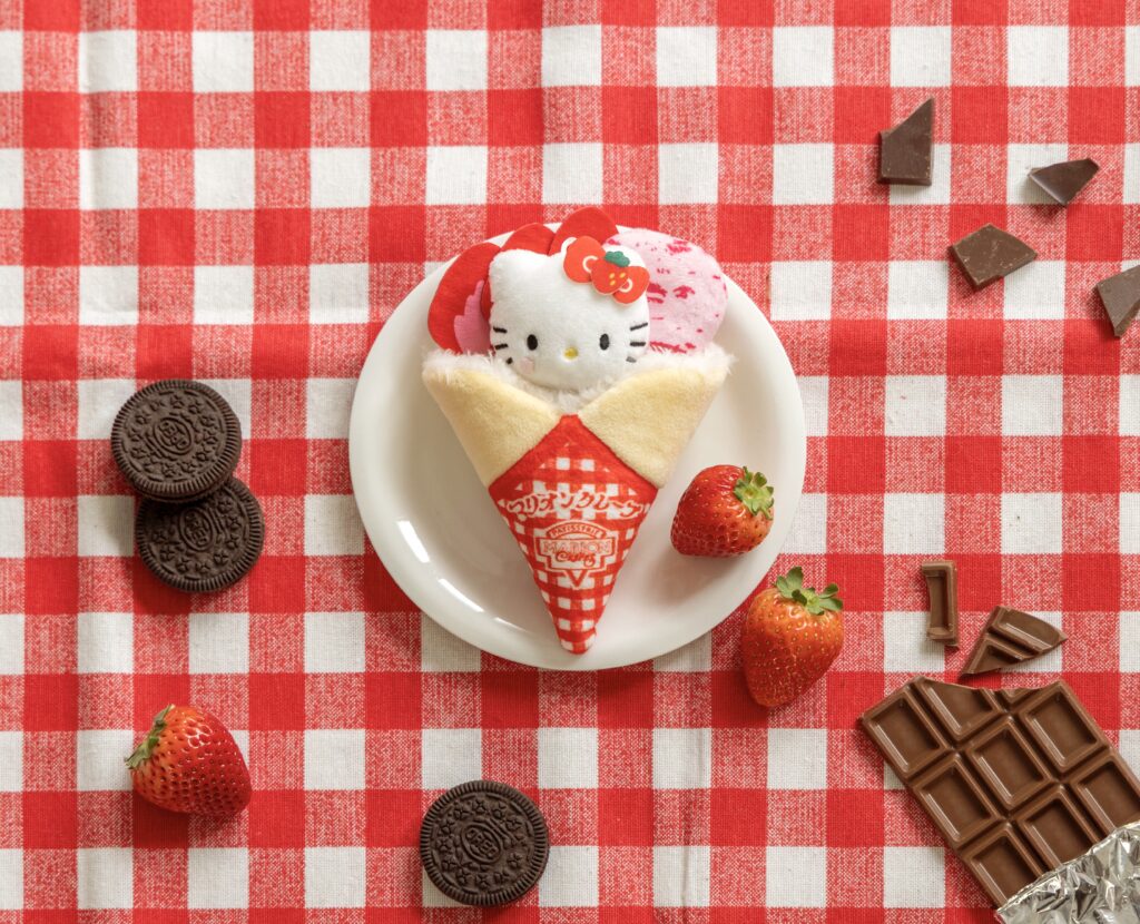 ぬいぐるみチャームは、「いちごスペシャル」「いちごチョコショコラ」「チョコミントクッキー」の3種をモチーフにしたデザイン。マリオンクレープのシンボルでもある赤いギンガムチェックの包み紙や、キティの顔についたクリームまで丁寧に表現されていて、細部まで眺めたくなる仕上がりです。バッグにつければ存在感たっぷりで、“ぬい活”のおともにもぴったりです。