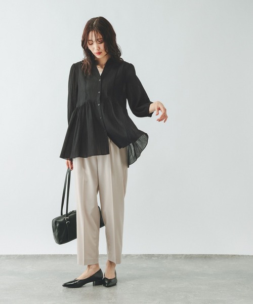 ウエスト切り替えの立体フォルムがメリハリを生むペプラムブラウス。スキッパー襟の抜け感で、顔まわりもすっきり、大人の余裕が漂う雰囲気に仕上がります。前を開けて軽く羽織れば、気温差のある日にも対応できて実用性も◎。乾きやすい素材で扱いやすく、忙しい毎日でも頼りたくなる優秀アイテムです。
