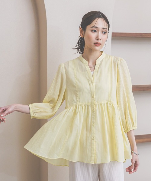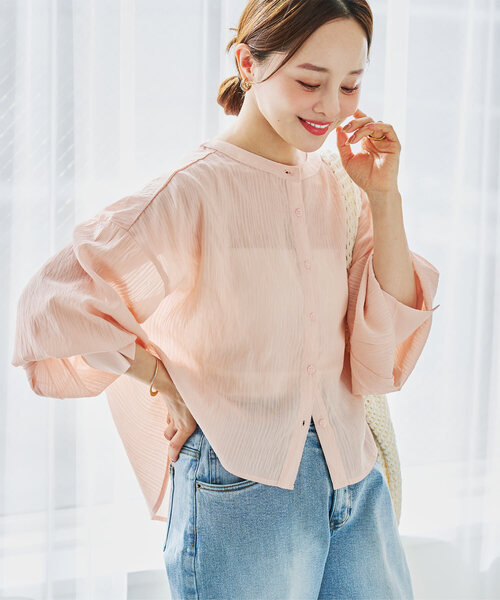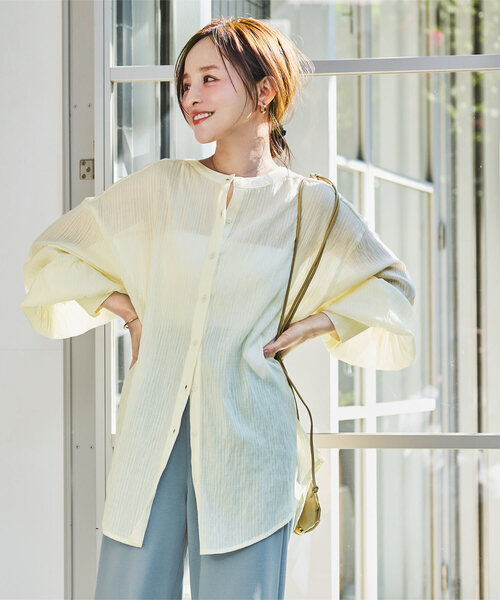 ほんのり透ける素材とボリューム袖が、着こなしに奥行きをプラスするシアーシャツ。丈の長さを選べ、ショート丈ならバランスの取れた旬の装いに、ロング丈なら気になる部分をカバーしつつ、軽やかにまとまります。バンドカラーだからきちんと感も備わり、手持ちのインナーにさらっと重ねるだけで、無理なく洗練された着こなしに。