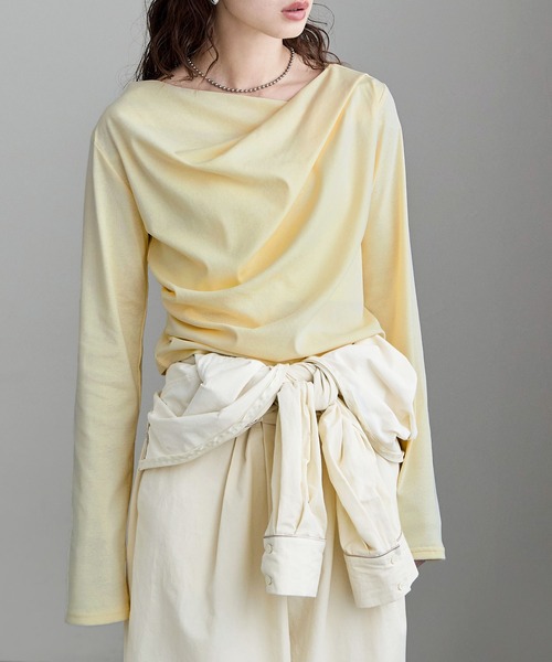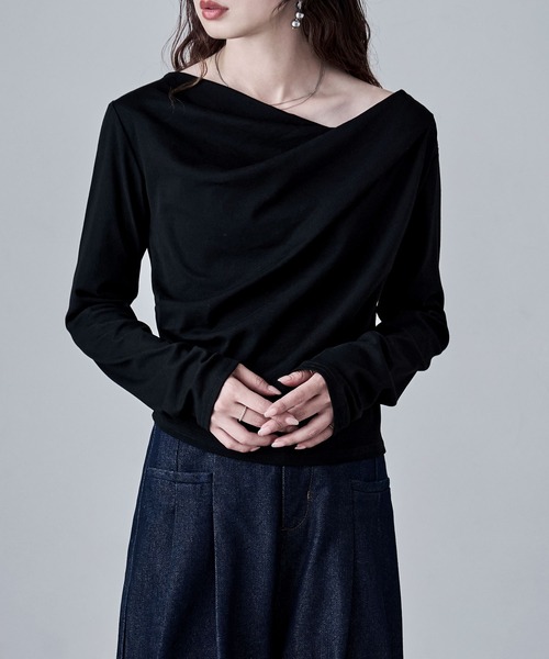 流れるようなドレープが、動きに合わせて表情を変える大人顔トップス。体のラインが目立たない落ち感のあるデザインで、さりげなく華奢見えを叶えてくれます。装飾に頼らず、シルエットだけで印象をつくれるから、ボトムはシンプルで十分。華美になりすぎず、静かに映える一枚です。