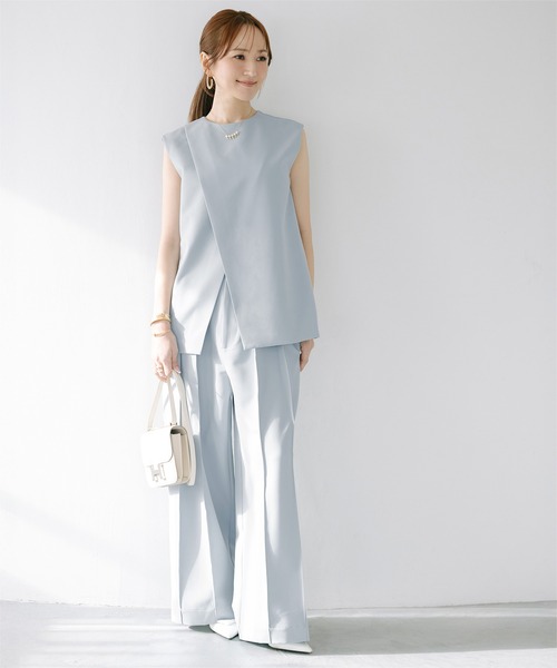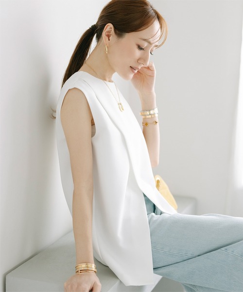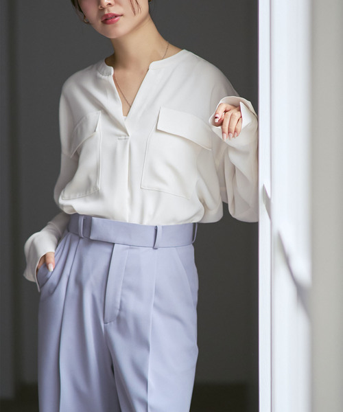 フロントのスリットが軽やかな抜けをつくり、派手見えしないのに存在感のあるブラウス。スマートなラインで一枚着としてはもちろん、アウターのインナーにも最適です。春夏はTシャツやシアーカットソーでエアリーに、季節が進めばニットレイヤードで印象を変えられる柔軟さも好都合。ワードローブに一枚あって損なし♡