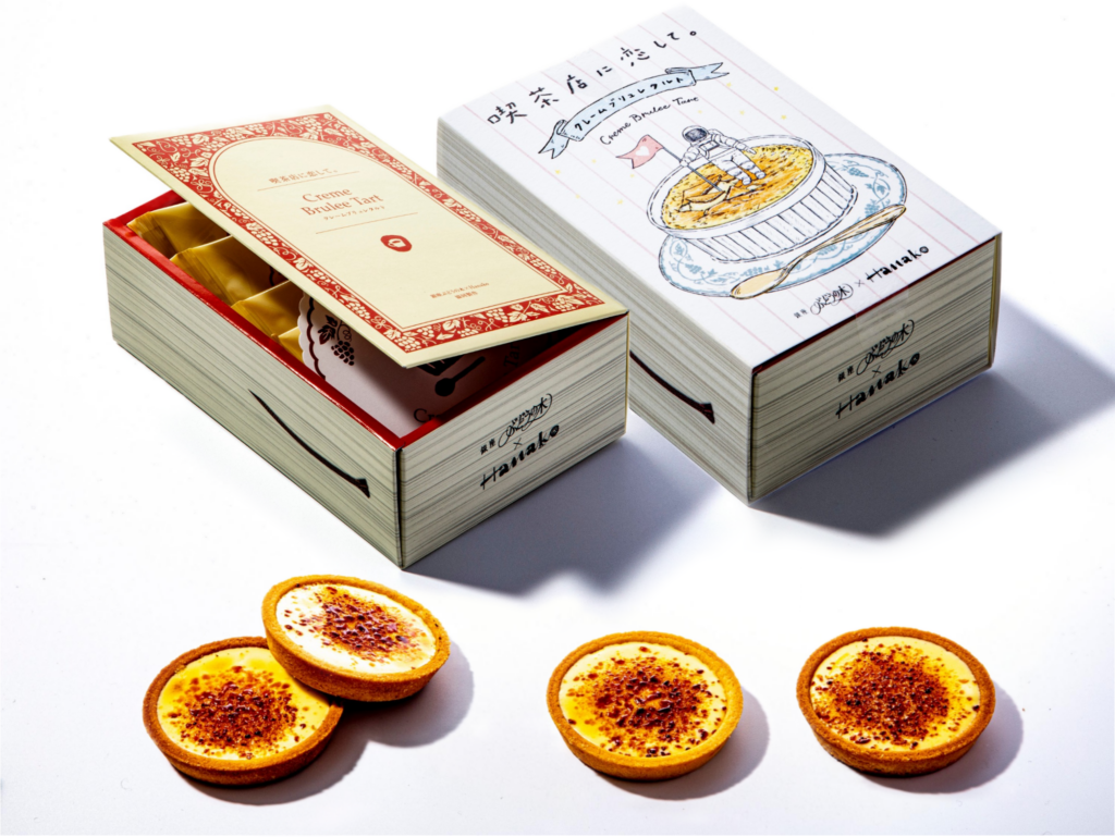 キャラメリゼのパリっとした食感が楽しめるクリームブリュレタルト。割るとクリーム層の下からほろ苦く香ばしいキャラメルソースが登場。パリとろ食感に思わず笑顔になれる一品です。まるで物語の1ページをめくるような、おしゃれなパッケージも魅力です。